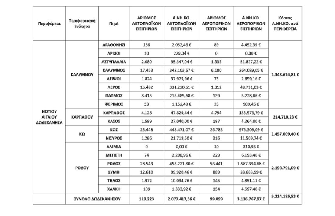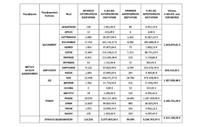 Η αναλυτική κατανομή των ποσών ανά νησί, καθώς και τα στοιχεία για τους δικαιούχους και τις επιδοτούμενες μετακινήσεις, αποτυπώνονται σε σχετικό πίνακα που συνοδεύει την ανακοίνωση, προσφέροντας πλήρη εικόνα της εμβέλειας του προγράμματος