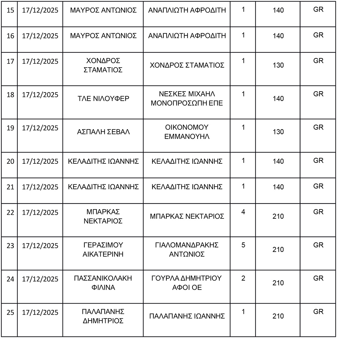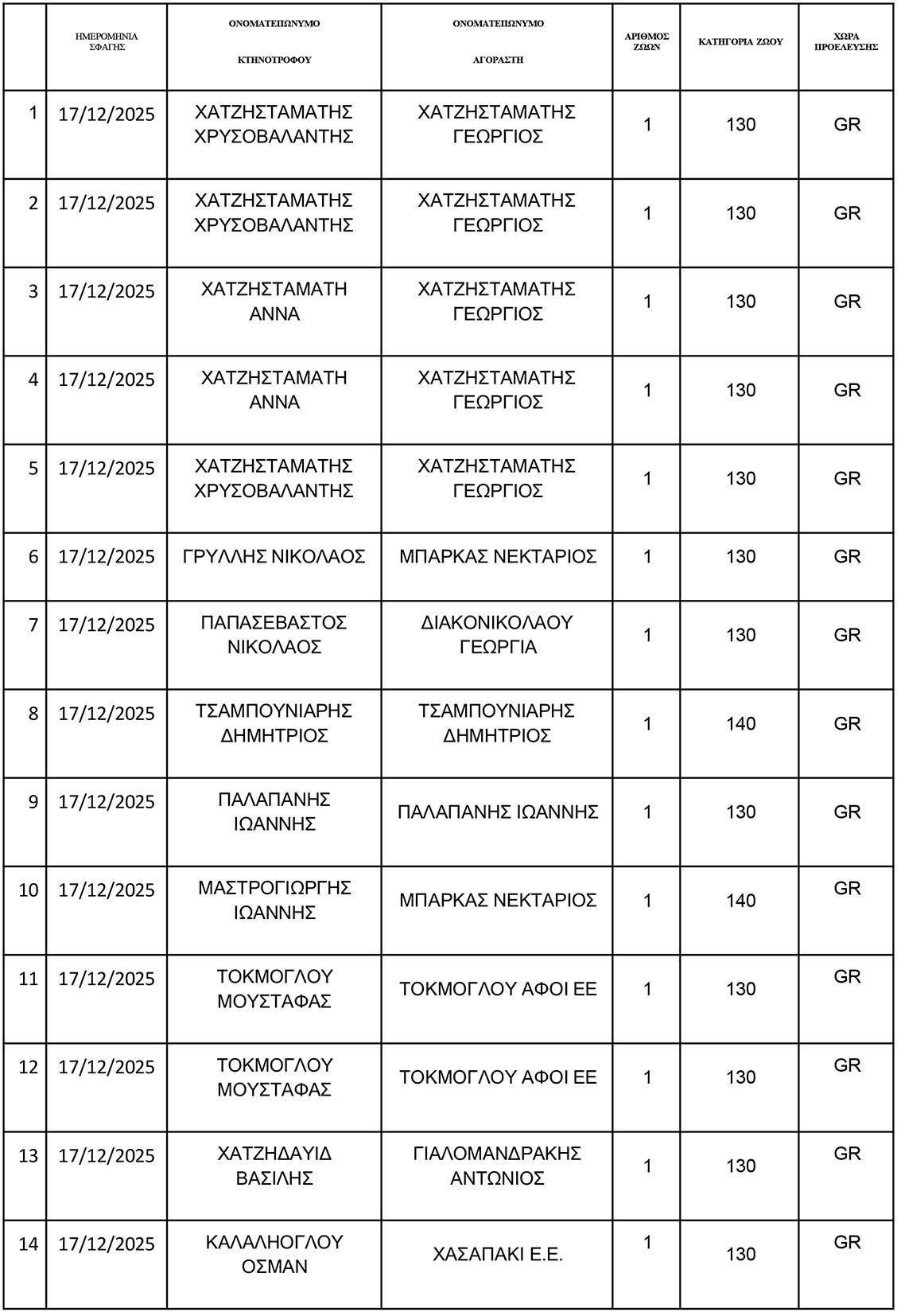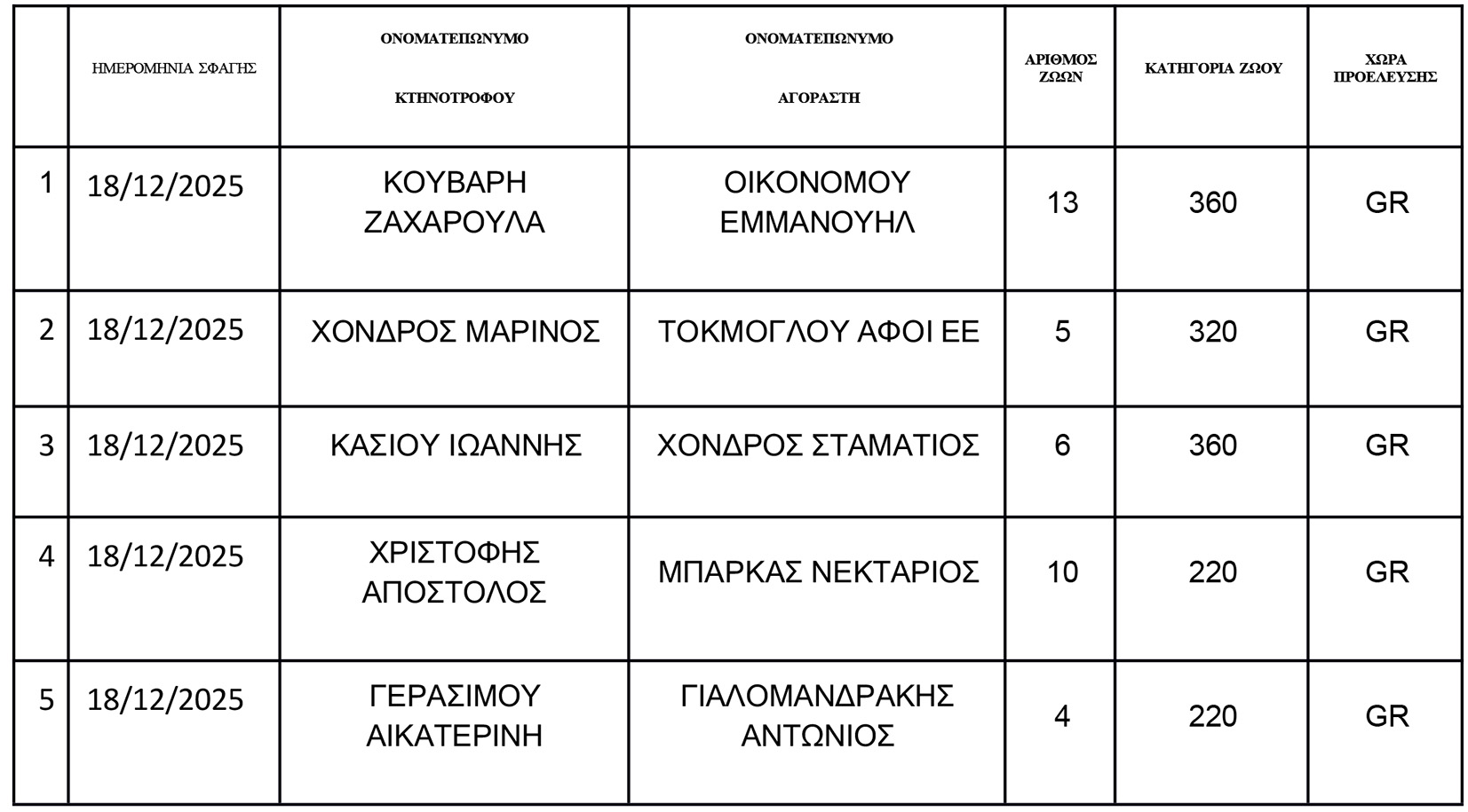 Σας παραθέτουμε πίνακα όπου απεικονίζονται αναλυτικά οι σφαγές οι οποίες έλαβαν χώρα στο Δημοτικό Σφαγείο Κω την Τετάρτη 17/12/2025 & την Πέμπτη 18/12/2025.